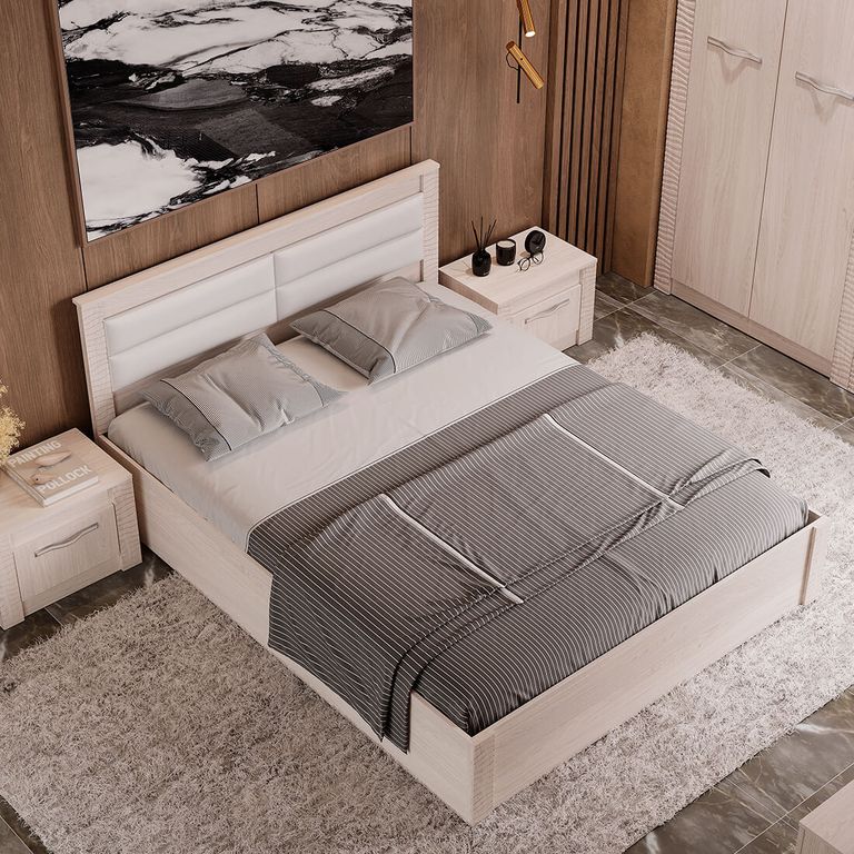Кровать двухспальная с мягким изголовьем Монако , купить в Казани в магазине Мебельмар.Кровать в цвете ясень белый.Кровать Монако купить Высокая Гора, Спальня Монако Высокая Гора купить.